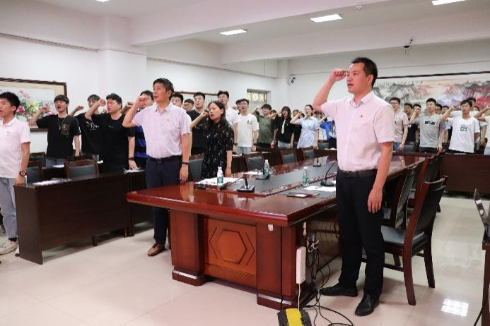 最后,由学生第六党支部书记李朝彪同学带领全体党员重温入党誓词,面对党旗,庄严宣誓。