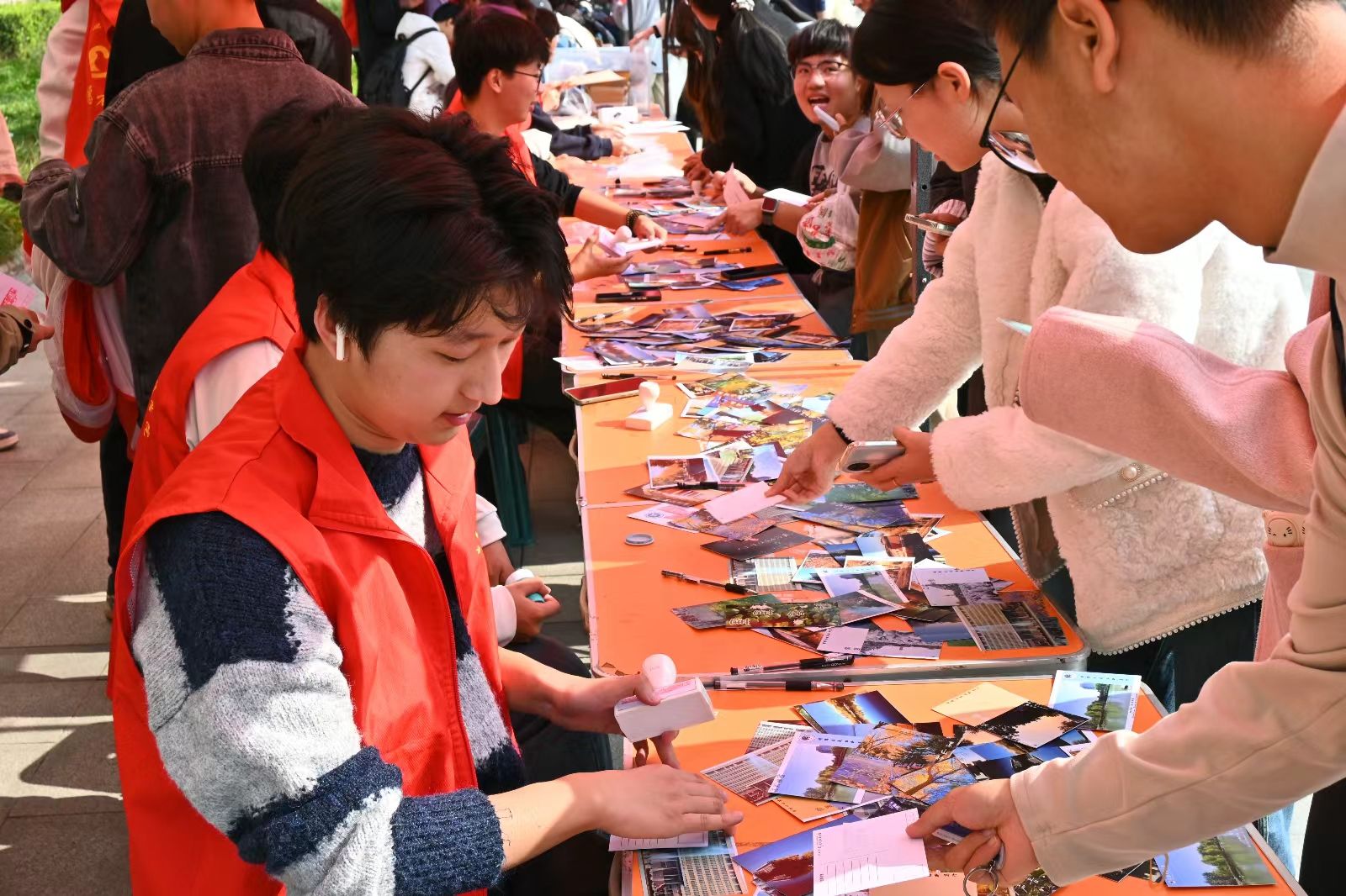 展览期间,钟楼广场成为校园文化打卡地。优秀作品沿展区有序陈列,细腻的笔触、鲜明的色彩吸引师生驻足欣赏、拍照留念。现场设置的纪念印章区与考研祝福墙更添温情,同学们在明信片上加盖专属印章,为备考学长学姐写下暖心寄语,让小小的明信片成为传递情谊的纽带。