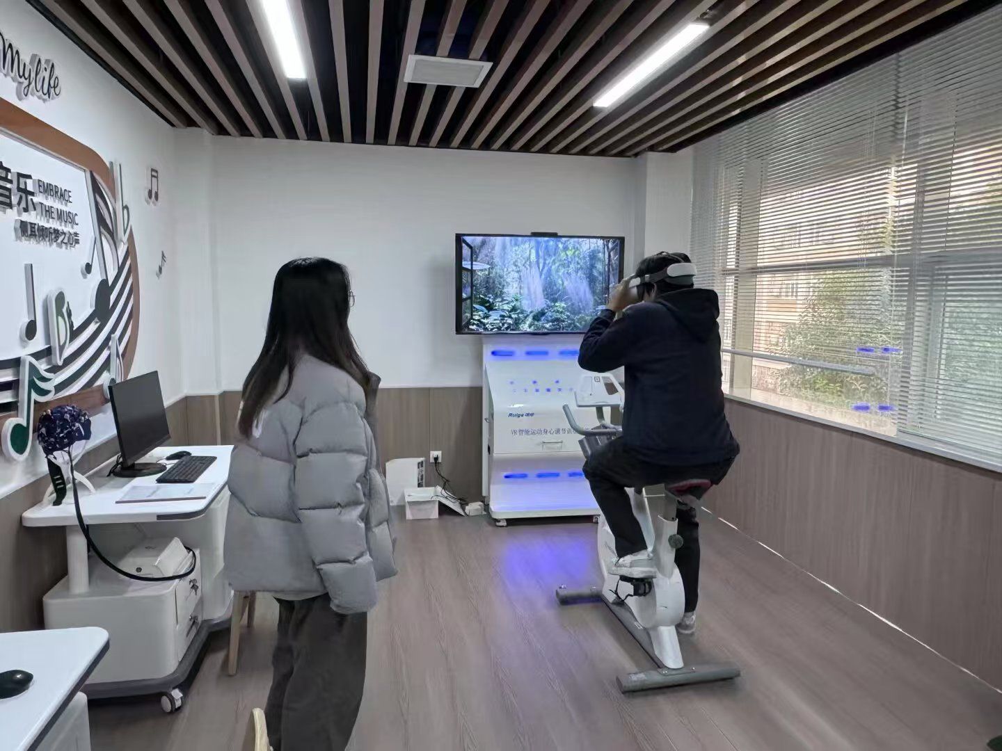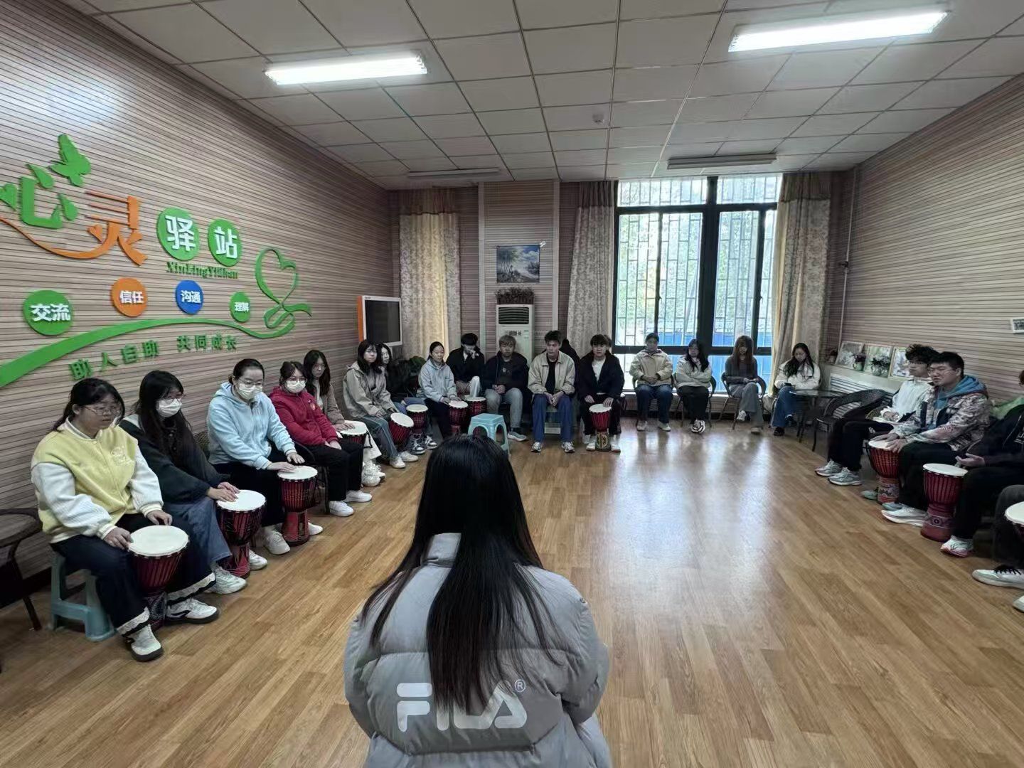 参观途中,同学们首先走进团体辅导室,参与练习非洲鼓项目,在节奏互动与协作配合中舒缓身心、增进默契;随后,同学们探访情绪发泄室,系统了解各类情绪疏导工具的使用方法并进行实践;紧接着,同学们走进一站式学生社区与勤园继续探索,在VR单车的沉浸式体验中释放压力、调节情绪;最后,同学们在心理剧场舞台直观感受情景演绎、角色扮演等心理疏导方式,进一步增加对心理健康调节方法的认知。