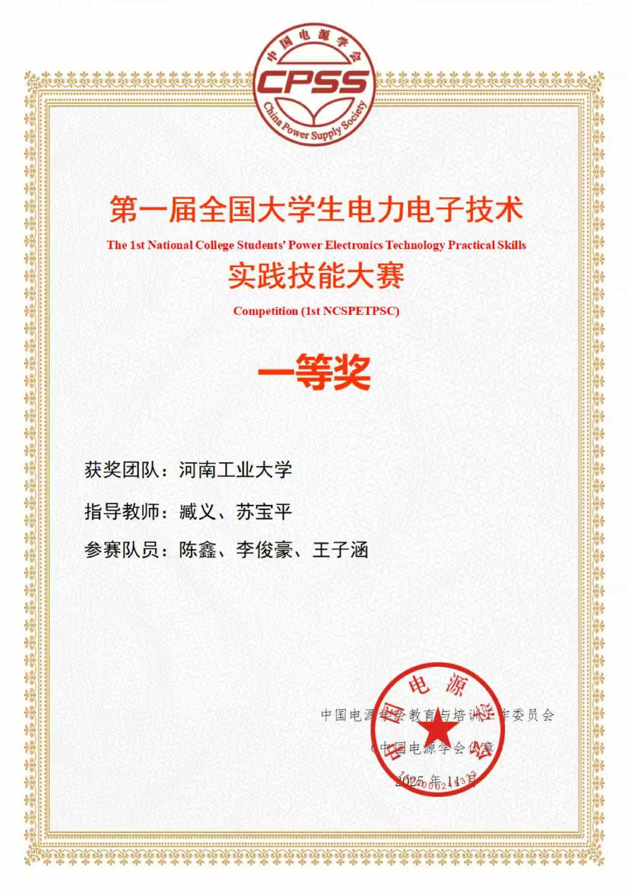 11月30日,第一届全国大学生电力电子技术实践技能大赛决赛在西安交通大学圆满收官。我校电气工程学院电气工程及其自动化专业学子不负众望,在臧义、苏宝平两位老师的悉心指导下,凭借扎实的专业功底和出色的实践能力,一举斩获全国一等奖,更以一等奖第一名的优异成绩摘得大赛最高荣誉“实践杯”。