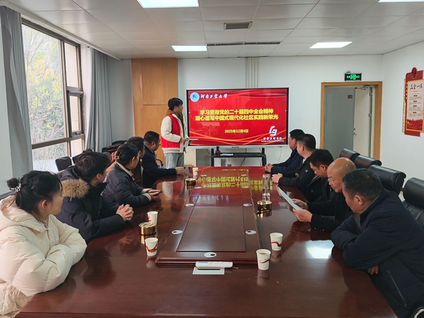 12月4日,河南工业大学电气工程学院大学生理论宣讲团走进郑州市高新区枫杨办事处大谢村,开展“学习贯彻党的二十届四中全会精神,凝心谱写中国式现代化社区实践新篇”主题宣讲会。大谢村村干部代表与村民代表参会,校青马班成员、电气工程学院团委学生会骨干张宸瑜担任主讲人。