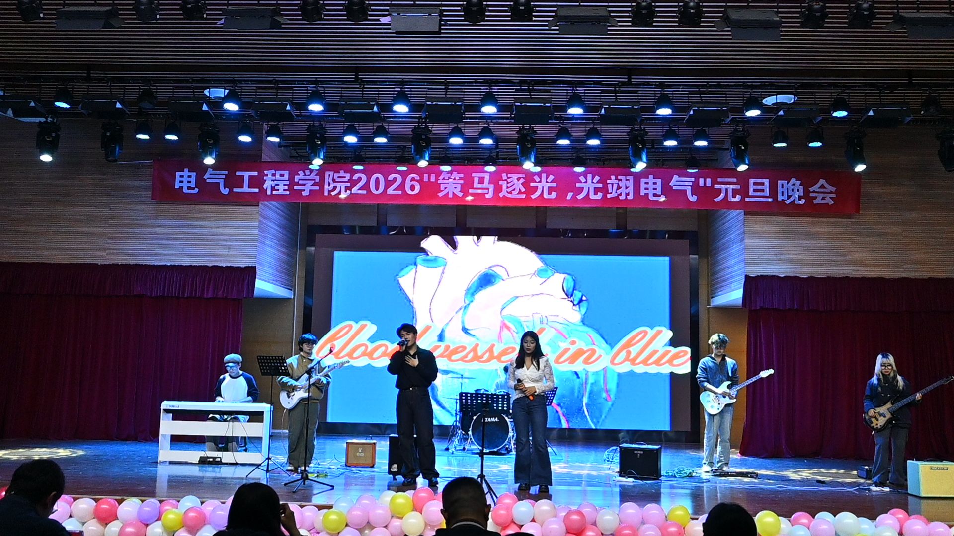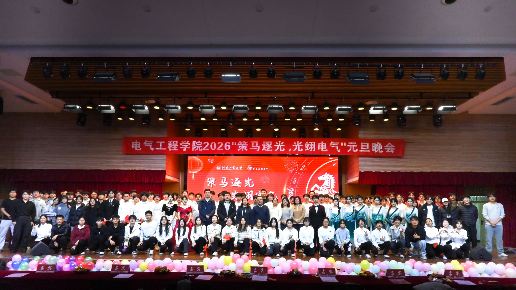 12月22日,电气工程学院“策马逐光 光翊电气”2026年元旦晚会在自华楼25201活动中心温情启幕。学院党委副书记张自广、全体辅导员、班主任代表与400余名学子共同观看演出。